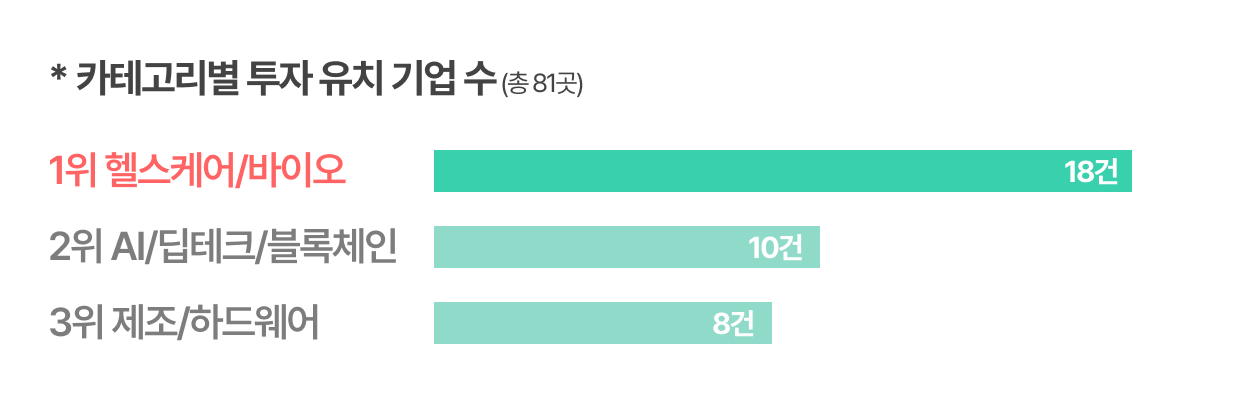 9월 투자 유치 기업 81곳 중 헬스케어/바이오 카테고리가 18건으로 1위를 차지했습니다. 뒤이어 AI/딥테크/블록체인(10건), 제조/하드웨어(8건) 카테고리가 차지했습니다. [4위-10위, 이어서 보기]