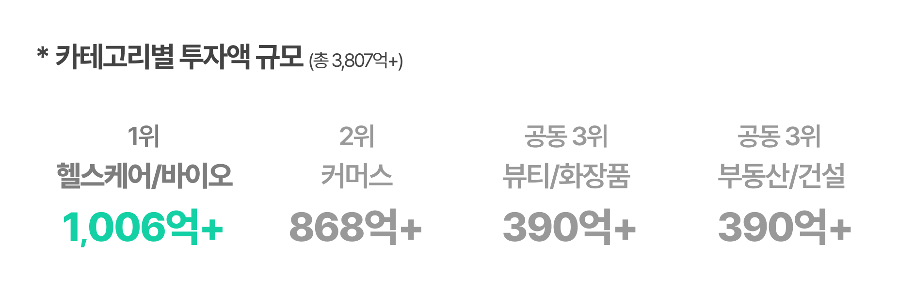 총 투자유치 금액 3,807억원 중 1위를 차지한 카테고리는 헬스케어/바이오입니다. 무려 1,006억원을 유치하였는데요. 뒤이어 커머스 카테고리가 2위를, 뷰티/화장품과 부동산/건설 카테고리가 공동으로 3위를 차지하였습니다. [4위-10위, 이어서 보기]